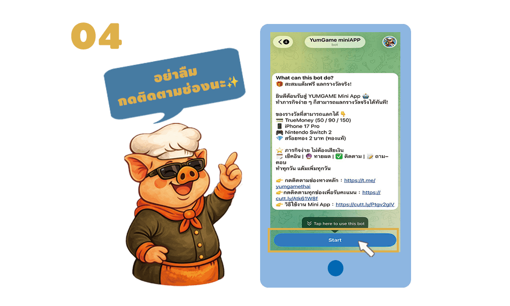 ดังนั้น เพียงแค่มีแอป Telegram คุณก็สามารถเริ่มใช้งาน YumGame ได้ทันที!