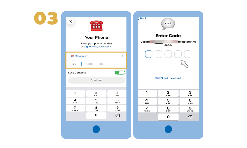 เลือกประเทศของคุณและกรอกเบอร์โทรศัพท์มือถือของคุณตามคำแนะนำบนหน้าจอ โปรดตรวจสอบหมายเลขให้ถูกต้อง ระบบจะทำการส่งรหัสยืนยันไปยังเบอร์โทรศัพท์ดังกล่าว