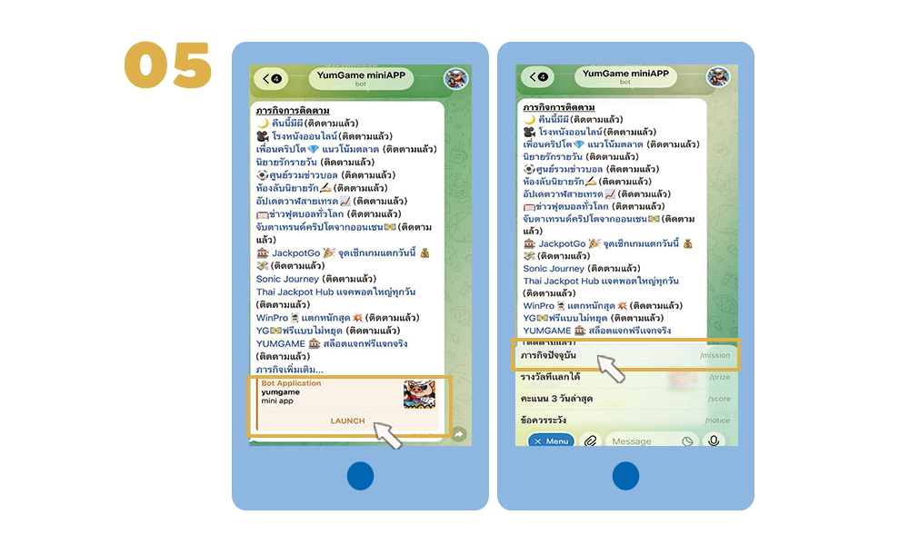 ภารกิจและฟีเจอร์ทั้งหมดของ YumGame จะทำงานผ่านระบบ Bot และ Channel บน Telegram โดยตรง